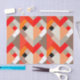 Tissue paper in a Mid-Century Modern design of layered triangles in shades of orange, tomato red, peach, and stone grey / grey, accented with white