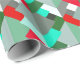 Wrapping paper in a Mid-Century Modern design of layered triangles in shades of turquoise, grey / grey, tomato red, and jade green, accented with white