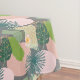 modern and trendy abstract tropical foliage tablecloth pattern that features a variety of pastel shapes, tropical leaves and fronds, on a medium grey background.