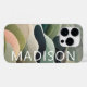 Modern Abstract Wavy Pattern Personalised Name iPhone 14 Pro Phone Cases features an abstract wavy pattern in grey, green and pink with your personalised name in white modern script typography. Perfect for personalised Christmas gifts and winter holidays. Designed by © Evco Studio www.zazzle.com/store/evcostudio