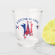 This is a modern ADDICTED TO PARIS Monogram Shot Glass, with the map outline of France in the TRICOLORE flag of FRANCE. Curved at the top, the text reads ADDICTED TO PARIS. Taking pride of place is a graphic of the Eiffel Tower (Tour Eiffel) and there are groups of red hearts. The curved heading on this patriotic Paris Lover Shot Glass is CUSTOMIZABLE, so you can replace with your own preferred greeting or delete. There is also a CUSTOMIZABLE MONOGRAM on the left and right. This Addicted to Paris Shot Glass would make a great gift for the spirits connoisseur, and a great addition to your Parisian-themed barware.