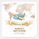 Neutral elegant world map travel airplane baby shower theme, adventure awaits baby shower theme, this design feature blue and yellow airplane fly over the gold world map decor with "Adventure Awaits" flag. Modern simple minimalist globe travel map baby shower theme, baby boy baby shower, you can customize your unique text and color.