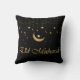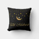Features Ramadan Eid lights and gold Eid Mubarak typography on a black background, nice modern Ramadan and Eid decorations for home or party. Eid pillow decoration by Arabix.