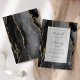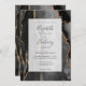 This elegant modern wedding invitation features a black watercolor agate frame trimmed with faux gold glitter. The customizable text combines charcoal gray handwriting, copperplate and italic fonts on a semi-opaque white rectangle. The reverse side features a matching black and gold agate design.