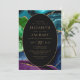 A bold watercolor agate frame in shades of teal blue, green, navy blue and purple trimmed with gold faux glitter provides the setting for the gold-coloured text on a black oval background. The reverse side provides space for wedding details, along with a QR code guests can scan to visit your website and RSVP, which saves the cost of printing and mailing separate RSVP cards.