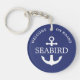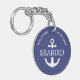 Anchor keychain with custom name and boat name. Stylish, nautical "Welcome On Board" keychain design template features a minimalist white anchor logo and placeholders for your boat name on an ocean blue background. Reverse side with space for skippers's name, a tagline and your contact details. Background colour is customisable. This easy-to-customise elegant anchor keychain makes a great promotional item for coastal professions and a smart gift for personal use © y.BEE SEA