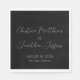 This modern and elegant event or wedding napkin features a simple black background with white text. The names of the couple are printed in a script font. The wedding date and location are printed below.