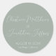 This modern and elegant event or wedding sticker features a simple eucalyptus green background with white text. The names of the couple are printed in a script font. The wedding date and location are printed below.