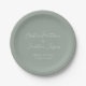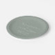 This modern and elegant event or wedding plate features a simple eucalyptus green background with white text. The names of the couple are printed in a script font. The wedding date and location are printed below.