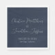 This modern and elegant event or wedding napkin features a simple navy blue background with white text. The names of the couple are printed in a script font. The wedding date and location are printed below.