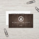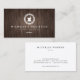 A clean, modern design of an apothecary logo with your name or business name creates a unique identity on this business card template. Set on a dark brown woodgrain background image. © 1201AM CREATIVE
