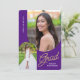 Invite friends and family to your "Grad Party" with the modern, 2 photo, purple and gold invitation. The design features photos with an arched edge. Custom text, on the reverse side, allows you to personalise with your party details.