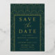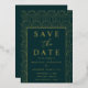 Elegant, art deco wedding save the date featuring a gold foil arch pattern with an emerald background. Personalise the modern art deco save the dates with your names and wedding details gold foil lettering.
