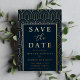 Elegant, art deco wedding save the date featuring a gold foil arch pattern with a navy background. Personalise the modern art deco save the dates with your names and wedding details gold foil lettering.