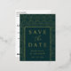 Elegant, art deco wedding save the date postcard featuring a gold foil arch pattern with an emerald green background. Personalise the front of the modern art deco save the date postcard with your names and wedding date in gold foil lettering. The back of the foil save the date postcard features your return address and wedding details such as the date, location, wedding website, etc. Designed to coordinate with our Modern Arch Deco wedding collection.