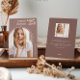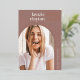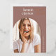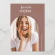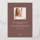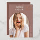 Modern photo graduation announcement features a vertical or portrait orientated photo in a unique arched layout, on a dusty mauve terracotta background accented with silver foil trim. The graduate's name and graduation year appear at the top, with the school name at the lower right. Add a personal message to the back, along with an additional photo.