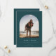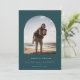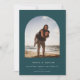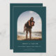 Modern arch frame, flat save the date photo card. Minimalist typography design style template with solid dark teal colour backgrounds.