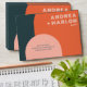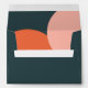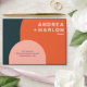 A modern boho wedding envelope giving a bright and fun retro vibe with its groovy arch abstract designs bursting a pop of colour orange, dark blue green and peach lettered with bold fonts.