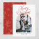 Modern arch merry Christmas greeting photo red Holiday Card. Features elegant calligraphy with family photo.