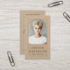 Modern, vertical, Kraft paper business cards with your arch shaped photo, name and title on the front, with a thin white border along the edge of the card. Customisable template fields for your contact information, social media and QR code on the back. You can change background and font colours, move and resize elements with the design tool.