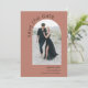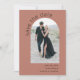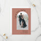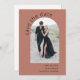 Beautiful simplicity and artistic boho style make this modern arch wedding save the date card pop with appeal. It features an arch shaped photo template on the front of the card to upload your desired photo. There is a text template on the front of the card to personalise with the bride and groom's names and planned wedding date. The back of this card has a sample message with additional details to personalise, along with a QR code template for making it easy for guests to view your wedding website. Shown here with an earthy terracotta background, this card is available in other colours as well.