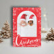 Arched at the top, your favorite photo is outlined in white on a red background and features Merry Christmas in chic lettering along with your names on the bottom.