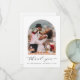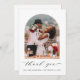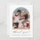 Minimal wedding thank you card for newlyweds featuring your photo in a modern arched picture frame, "thank you" in an elegant script and your Mr & Mrs name and wedding date in simple typography. On the reverse, you can personalise a thank you message and add your first names as a signature.