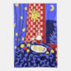 Modern and decorative digital artwork in expressive and bold colours representing a night scene with the Moon seen from a window of an interior with a table covered with blue cloth with botanical pattern, blue curtains with floral pattern, red chequered wall with a sun ornament. A plate with some lemons, grapes and apples scattered on the table, a bottle and a glass of red wine. This genuine artwork by Tanjica is greatly inspired by Henri Matisse and is not a copy of any of his masterpieces.