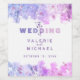 Modern artistic wedding invitation design featuring an abstract grunge background in purple and pink shades with modern and bold distressed typography.