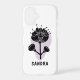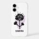 A sleek white phone case featuring a modern, stylized black floral design with abstract petals and stems, set against a subtle lavender teardrop background. Below the flower, the name "SANDRA" is printed in bold, artistic lettering, making it a personalized and elegant accessory.
