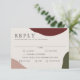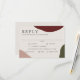 An artistically styled wedding response card that conveys simple elegance, this design has a rich autumn colour palette in burgundy wine red, terra-cotta and hunter green abstract shapes along the edges of the design. An ecru background blends well with the fall colours. The type face is crisp and elegant in its simplicity. This RSVP card has a text template that includes menu entree selections for your guest to select their preferred meal choice. You can personalise the mail choices with your own wording as well as the required RSVP date.