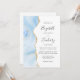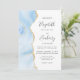 The left-hand edge of this elegant modern wedding invitation features a pastel baby blue watercolor agate border trimmed with faux gold glitter. The customisable text combines handwriting, copperplate and italic fonts in charcoal grey on a white background. The reverse side provides space for wedding details on a solid white background, along with a QR code guests can scan to visit your website and RSVP, which saves the cost of printing and mailing separate RSVP cards.