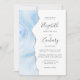 The left-hand edge of this elegant modern wedding invitation features a pastel baby blue watercolor agate border trimmed with faux silver glitter. The customisable text combines handwriting, copperplate and italic fonts in charcoal grey on a white background. The reverse side features a matching baby blue and silver agate design.