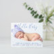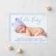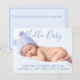 Announce the arrival of your special bundle of joy with this great "Hello Baby" in blue script and purple typography with soft blue background. Add baby's photo, name, stats on the front and include a message on the back or leave blank and hand write a personal message later. Not gender specific. Beautiful colours for boy or girl. Font colours can be changed - go to customise further. Please email me if you need help making this more your own or to help suit your photo. designsbykatz@gmail.com