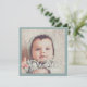 A unique square format modern baby birth announcement with a blue green border and a white typography overlay with type in the round, and your baby's date of birth and birth stats against a soft subdued baby photo, with baby's face front and centre encircled by type. At the bottom of the card is a white script overlay "welcome" Simply add your baby's photo, name and stats.