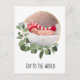 Minimalist Christmas baby birth announcement postcard design with a modern font for "Joy to the world" The beautiful gold ring is delicately decorated with green leaves and white flowers. Personalise the names, greeting, birth details, address and photo with your own. A wonderful baby's first Christmas keepsake.