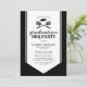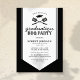 Summer backyard bbq graduation party invitations featuring a classic black background, a white graduation sash centrepiece, a mortarboard cap, barbecue utensils, and a modern text template that is easy to personalise. On the back is a rustic plaid pattern.