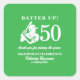 Celebrate a milestone in true baseball style with this striking 50th birthday Thank you sticker. The design showcases a white silhouette of a batter swinging toward a bold 50, set against a vivid green background. Fun text lines — “Batter up!”, “50th Birthday Party”, and “Hitting Fifty” — bring energy and humor to the design. Personalize all wording to fit your special celebration.
