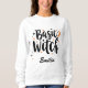 Modern Halloween custom shirt design features "Basic Witch" text in black calligraphy-style typography. Makes for the best personalised Halloween gift for her - your friend, girlfriend, sister or even your neighbour! Perfect to make them feel special, boost their confidence and get a unique and sassy gift!