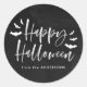 Festive and fun Halloween stickers featuring “Happy Halloween” in a white, hand-lettered modern script font, accented by flying bats on a dark chalkboard background. Personalise these custom Halloween stickers with your name or other custom text. Perfect for sealing envelopes, decorating Halloween party favours, and adding a festive touch to gifts, treat bags, and more.