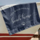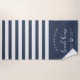 Modern brush script reading BEACH HOUSE alongside your family name in a trendy typography driven design. These preppy navy blue personalised beach towels add a chic touch to your home away from home. They feature a stylish seashell illustration between your city and state and the year your family home was established.