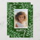A modern Merry Christmas photo card with botanical leaves and berries - green, white and teal. The modern design includes eucalyptus branches and berries and sans serif type for the main part of the text. The greeting is in a rustic modern script. The back includes a eucalyptus pattern in greens and white.