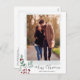 A modern calligraphy Christmas photo postcard template featuring a watercolor berry leaf branch. THE SAMPLE FAMILY PHOTO IS NOT INCLUDED. REPLACE WITH YOUR OWN PHOTO BEFORE ORDERING.