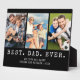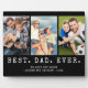 Modern BEST DAD EVER 3 Photos Personalised Easel-Back Plaque. Create a personalised, custom photo collage photo display on this easel-back plaque for a father featuring 3 pictures, your custom title and/or message in your choice of font styles and colours and background colour (shown in white on black). The sample is shown with the title BEST. DAD. EVER. Makes a memorable keepsake gift for Dad for his birthday, Father's Day or a holiday. OPTIONS: The sample is shown on the 8x10 size; other sizes are available on the ordering. ASSISTANCE: For help with design modification or personalisation, colour change, resizing or transferring the design to another product, contact the designer BEFORE ORDERING via Zazzle Chat or makeitaboutyoustore@gmail.com.