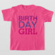 Custom "Birthday Girl" shirt features modern text design in shades of hot pink, blue, & purple. Personalise the text with your child's age number on the back. Colours can all be customised.