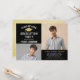 Announce your graduate in style with this modern yet elegant graduation party invitation. Design features a black background with two spaces for senior photos, gold and white wording that can be personalised with the graduate's information and party details, and a simple pattern of white diagonal stripes on the back of the card. The text and background colours can be customised.