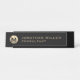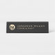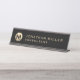 Elevate your desk with this luxurious black and gold desk name plate featuring a round brushed metal monogram emblem and name in golden text on a solid black background. The perfect addition to any professional setting.