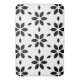 A chic black and white abstract floral print features elegant black flower petal shapes on a crisp white background.