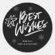 Modern Black and White Best Wishes Classic Round Sticker. Personalise it with your name. You can make the snowflakes big or small and keep them wherever you want.