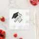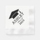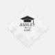 Custom graduation party napkin design features a black grad cap with the graduate's name and class year. Customise the black font colour via Customise It.